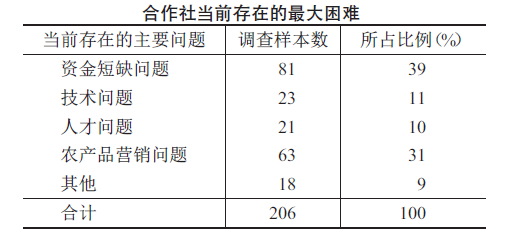调查显示,资金短缺是合作社当前存在的各种问题中的主要问题,占39%(见下表)。