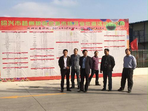 2014年10月28日上午,绍兴市社下属绍兴市粮食批发市场正式开业。绍兴市供销总社主任阮建明、副主任张兴昌、副调研员陆应华、绍兴市发改委粮食购销调控处丁国庆处长在绍兴市粮食批发市场总经理鲁海根的陪同下,参观了绍兴市粮食批发市场简朴的开张仪式,并走访了已招租开张营业的140余户经营户及350余间营业房。